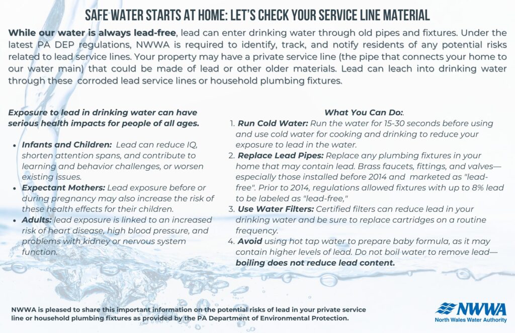 In line with the latest regulations, NWWA is fully committed to ensuring your water remains safe. As required by Federal and State guidelines, we actively identify, track, and notify residents about any potential risks from these lines, and provide regular water quality updates to keep you informed.
